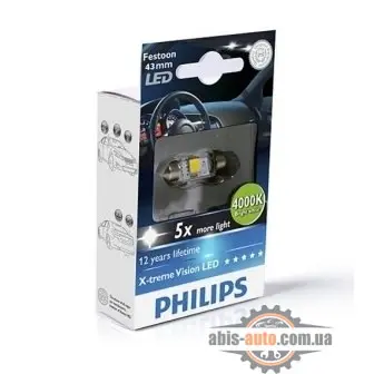 Высокомощные светодиоды C5W Festoon T10,5x43 Philips X-tremeVision LED 12V 1W дают в 5 раз больше света по сравнению с обычной. Все размеры идентичны штатным. X-tremeVision потребляет в 13 раз меньше электроэнергии, чем заводские лампыМы советуем устанавливать данные LED лампы, если Вы хотите получить современное и красивое, белое свечениеПрием заказов